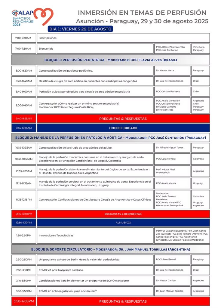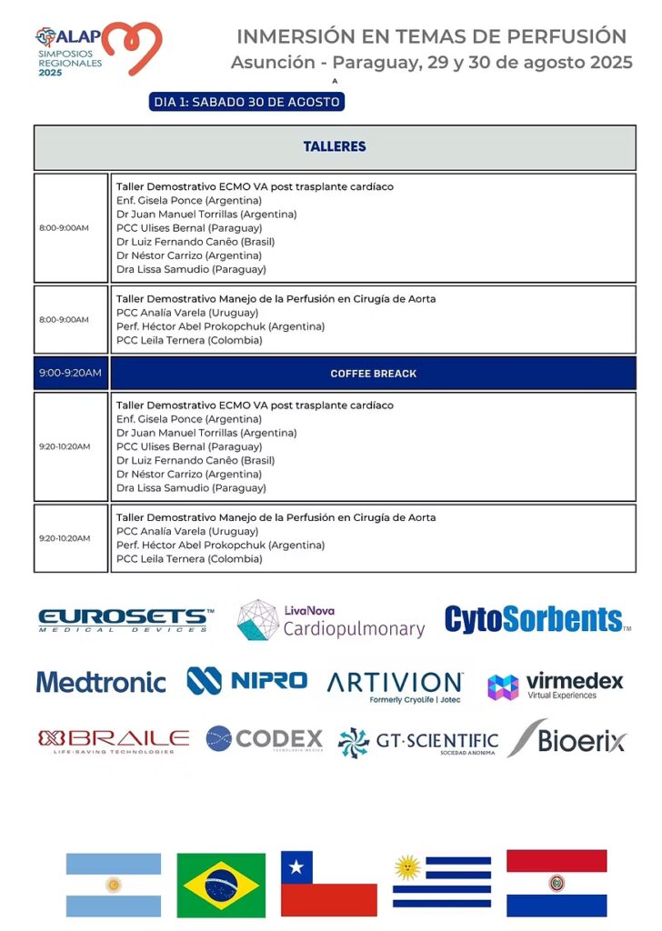 En constante búsqueda de mejorar la calidad profesional de nuestros perfusionistas Latinoamericanos, la Asociación Latinoamericana de Perfusión ALAP los invita a participar en el los Simposios regionales 2025 “Inmersión en temas de Perfusion”. Región Andina se realizará en Bogotá, Colombia, los días 30 y 31 de mayo.